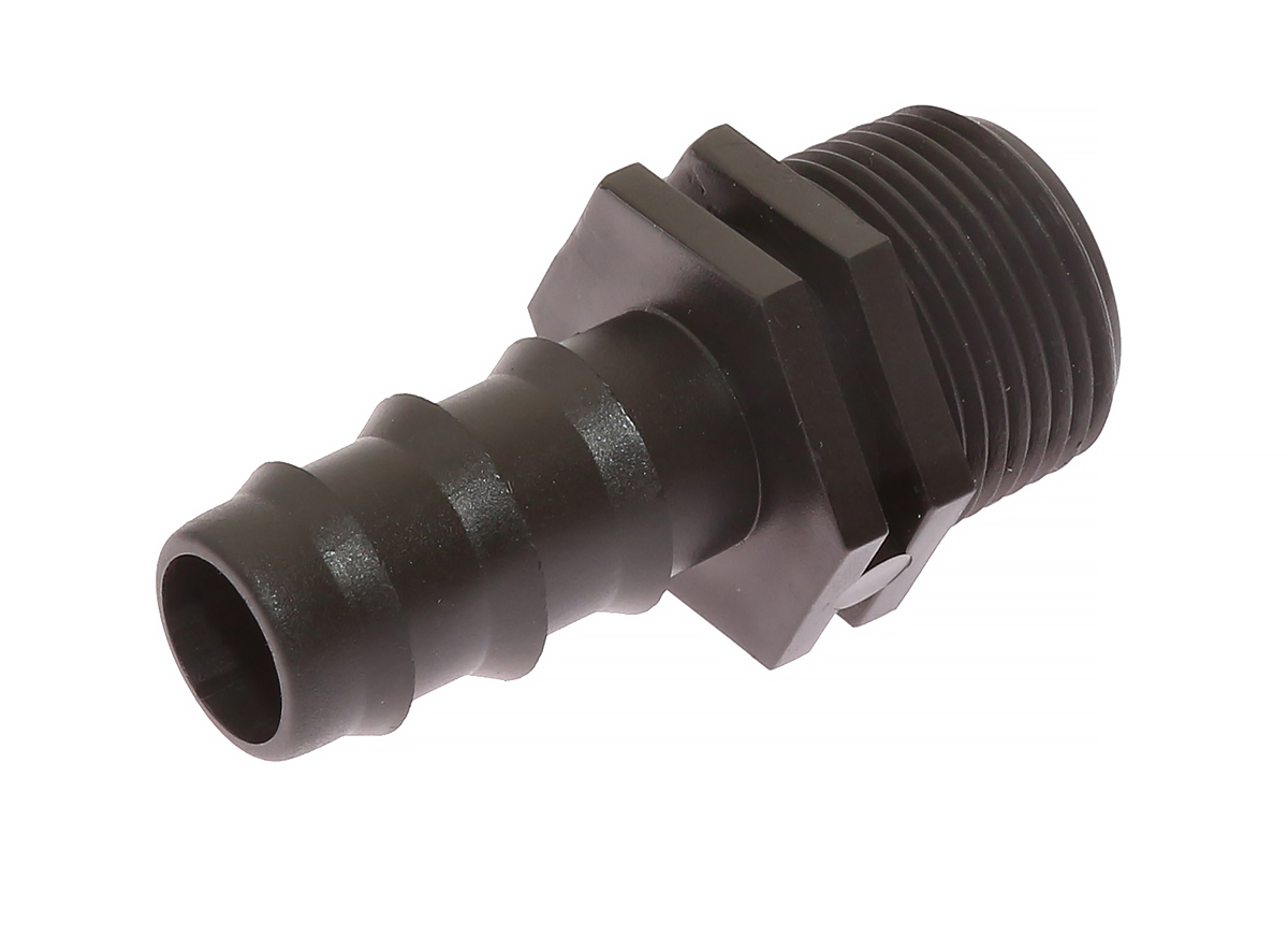 Kolejny typ łącznika wykorzystywany przy budowie złożonych systemów nawadniania lub łączeniach z liniami kroplującymi. Powyższy łącznik posiada gwint zewnętrzny 3/4 cala oraz wtyk na wąż fi 20 mm. Co ważne, wtyk posiada trzy poprzeczne profilowania, które sprawiają, że raz założony wąż będzie trwale i szczelnie utrzymywał połączenie z łącznikiem. Oferowany łącznik do systemów nawadniania został w całości wyprodukowany z wysokiej jakości tworzywa sztucznego. Charakteryzuje go wysoka wytrzymałość i odporność na wszelkie warunki pogodowe - niskie lub wysokie temperatury.Produkt sprzedawany na sztuki. Możliwość nabycia opakowania zbiorczego liczącego 25 sztuk.