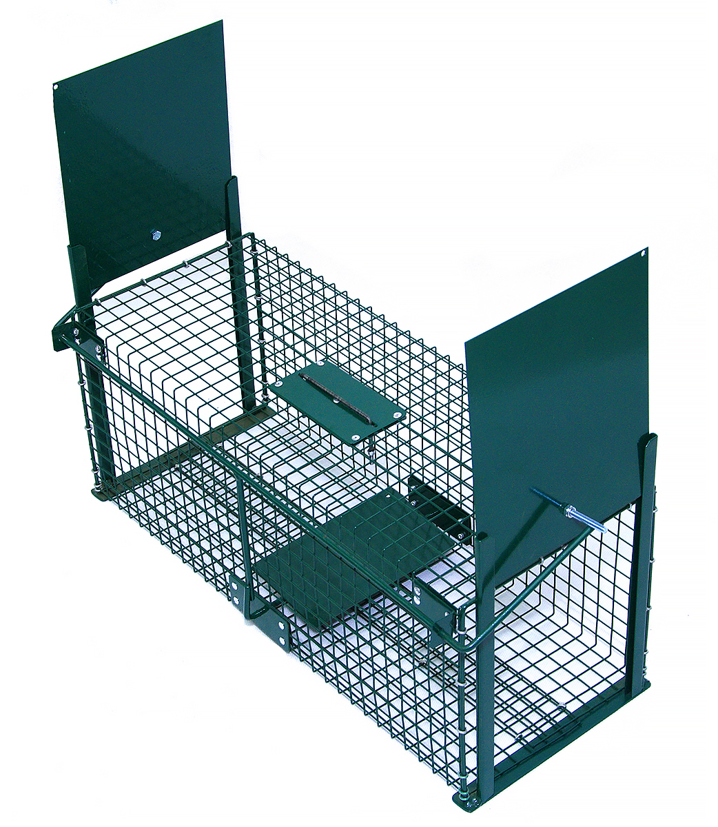 Dwuwejściowa pułapka żywochwytna na szczury, tchórze i łaski. Skuteczna pułapka żywołowna to rozwiązanie problemu ze szczurami lub tchórzami atakującymi nasz kurnik. Pułapka na szczury wyposażona została w czuły system zapadkowy, który aktywowany jest pod wpływem dotknięcia płytki z przynętą. Co ważne, pułapka żywochwytna pracuje w sposób humanitarny i złapanemu zwierzęciu nie zostaje wyrządzona żadna krzywda.Pułapka żywołowna na tchórze i łaski posiada 61 cm długości. Każde wejście do klatki ma wymiar 21 x 20 cm. Płytka, która połączona jest z zapadkami znajduje się na samym środku pułapki na szczury. Nastawienie pułapki na łaski to kilka prostych ruchów, które zajmują kilka chwil. Obie zapadki powinny zostać ustawione w sposób widoczny na zdjęciach, w efekcie czego będą one spadały pionowo w dół, uniemożliwając szkodnikom opuszczenie klatki. Pułapka żywołowna na szczura wyprodukowana została z wysokiej jakości materiałów. Krata zgrzewana o oczku 20 mm została stworzona z drutu stalowego fi 1,8 mm. Całość pokrywa zielona warstwa PCV, dzięki czemu klatka jest lepiej akceptowana przez zwierzaki. Klatka posiada solidną konstrukcję, która jest całkowicie odporna na agresywne zachowania schwytanych zwierząt. U góry pułapki na tchórze umieszczono rączkę (dodatkowo osłoniętą od dołu blaszką ochronną), aby móc komfortowo przenosić klatkę. Pułapka na szczury dostarczana jest do klienta w złożonej formie, widocznej na zdjęciach.