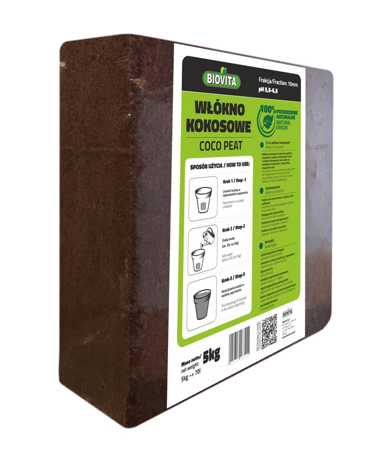 Sposób użycia: Kostkę włókna kokosowego umieścić w pojemniku, następnie dodać wodę i poczekać aż podłoże napęcznieje.