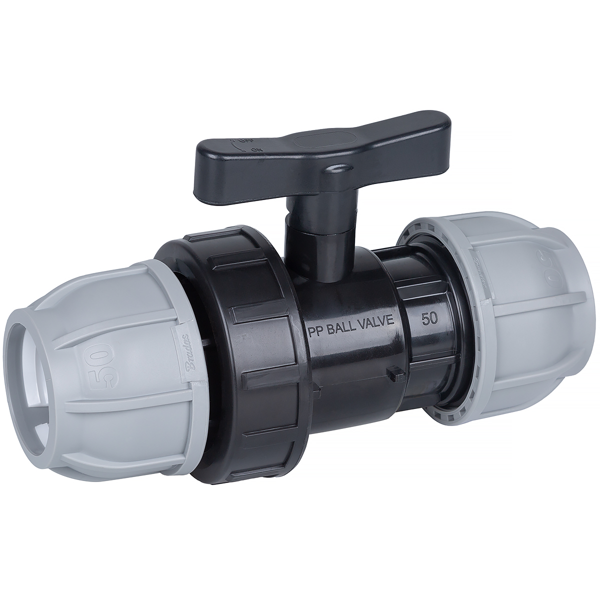 Zawór został wykonany z wysokiej jakości tworzywa sztucznego. Wewnątrz zaworu znajdują się uszczelki oraz pierścienie zaciskowe na rurę, co gwarantuje szczelność połączenia. Zawór kulowy PN10 przeznaczony jest do instalacji wodnych z ciśnieniem do 10 Bar.