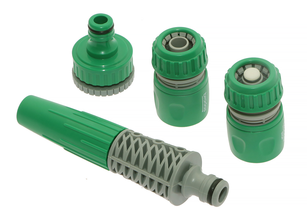 Praktyczny zestaw zraszający przeznaczony do montażu z wężami 1/2 cala. Dołączone przyłącze na kran pozwala na montaż na kranach z gwintem 1/2 lub 3/4 cala. Dołączone szybkozłączki pozwalają na szybkie i szczelne łączenie węża z przyłączem i dyszą zraszającą lub dowolnym elementem systemu nawadniania takim jak lanca zraszająca lub zraszacz wahadłowy.