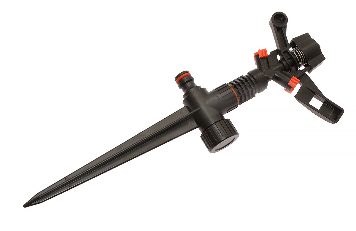 Praktyczny zraszacz do systemów nawadniania wykonany z wysokiej jakości tworzywa sztucznego. Zraszacz wbija się w ziemię za sprawą mocnego bolca o długości 17 cm. Całość jest solidnie utwierdzona w podłożu. Plastikowy zraszacz pulsacyjny ma ruchomą głowicę, która jest w stanie nawodnić pole zraszania w wysokości 17 m. Zraszacz pulsacyjny wyposażony jest w jedno odejście na standardową szybkozłączkę do wpięcia do systemu nawadniania. Atutem zraszacza do systemu nawadniania jest przelotowa konstrukcja, która pozwala na szeregowe łączenie kilku zraszaczy. W celu połączenia zraszaczy należy odkręcić korek spustowy z gwintem zewnętrznym 3/4 cala i wkręcić przyłącze na kran, pod które można szybkozłączkami podłączyć wszystko. Zraszacz doskonale sprawdza się do nawodnienia ogrodów, działek, warzywniaków i innych terenów zielonych. W ofercie posiadamy również zraszacz pulsacyjny metalowy.